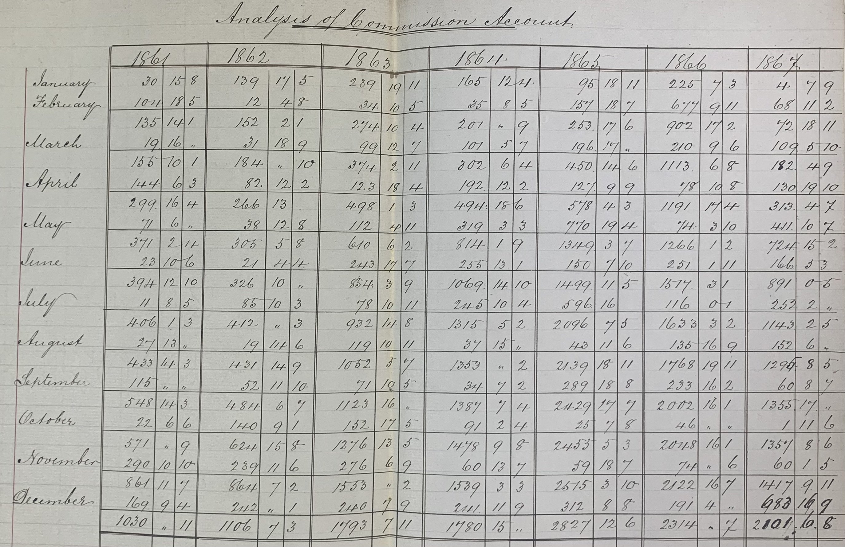 The whole idea of being 160 years old started with the 125th anniversary celebrations that took place 35 years ago. The key words added to the small print then were “at least” 125 years old. The year 1861 was “chosen” as the beginning simply because the oldest document in existence is a Commission Account (shown below) which shows income in January 1861 for the sole proprietorship of E E Wendt (the original name of W K Webster & Co) as £30 15s 8d. In fact, 1861 turned out quite well for the firm: fees earned amounted to just over £1000, which in today’s money would be around £120,000.